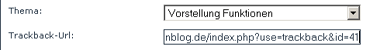. Und ich komm zufällig in ihrem Blog vorbei und lese diesen Beitrag. Dann könnte ich nun entweder erstmal kurz bescheid geben (in den Kommentaren), dass ich mitmache oder ich nehme mir die Trackback-Url mit (siehe Abbildung1).