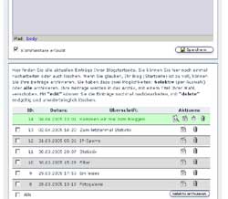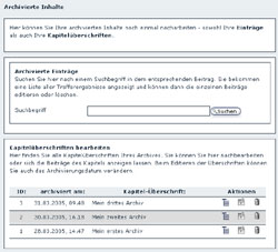 Das Archiv hat zwei neue Funktionen bekommen. Das für einen DesignBlog typische "Selektive Archivieren" ist geblieben, neu ist eine interne Suche mit der man im Admin seine Beiträge nach einem Stichwort durchsuchen kann. Neu ist auch die Ansicht der bereits angelegten Archive, nicht mehr in einem Selektor sondern tabellarisch sieht man die letzten 20 Archive. Sind es mehr als 20 kann man über einen Pager die nächsten 20 aufrufen. Per Mausklick lassen sich dann auch alle Beiträge eines Archivs anzeigen. Eine neue Funktion ist beim bearbeiten der Archiv-Headlines hinzugekommen, über den Kalender kann ein Archiv umdatiert werden. Das wird sicher alle die freuen, die meistens am Anfang eines neuen Monats archivieren und sich dann geärgert haben, dass das Archiv im neuen Monat gelandet ist, obwohl es eigentlich die Beiträge des vergangenen Monats beinhaltete. Jetzt kann man das Archiv einfach rückdatieren und so alle Beiträge in den richtigen Monat verschieben.