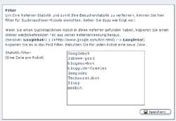 Eine der letzten Funtionen, die implementiert wurden, war die Filterfunktion für die Statistik. In vielen Mails und Wünschen haben wir oft vernommen "Nehmt doch mal die Suchmaschinen aus meinen Referrern heraus." Diese Funktion ist nun da.