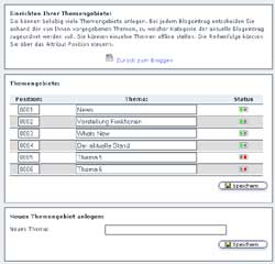 In Abbildung 2 seht Ihr die Themenverwaltung selbst, hier könnt Ihr neue Themen anlegen, die Namen verändern, die Reihenfolge ändern und Themen on- und offline stellen.